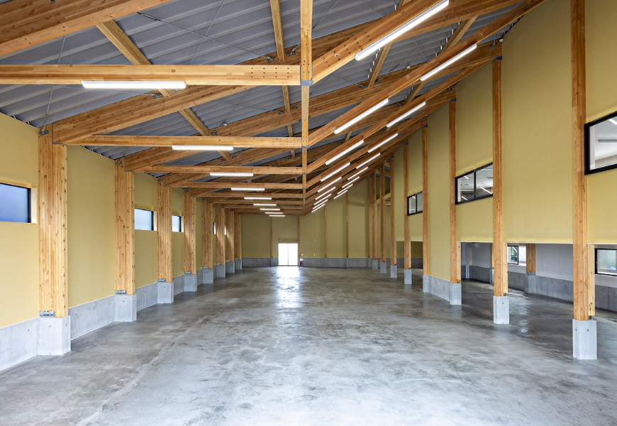 当初は地元ゼネコンと相談を進めていた同社。500㎡を越える建築物では木造は無理だと考えていらっしゃったが、木造での建築が可能ということ。また、倉庫内に柱を立てずに建築が可能ということで採用に至った。鉄骨に比べ断熱性能が段違いであることから、従業員の作業効率がUP。生産性向上にも寄与した。